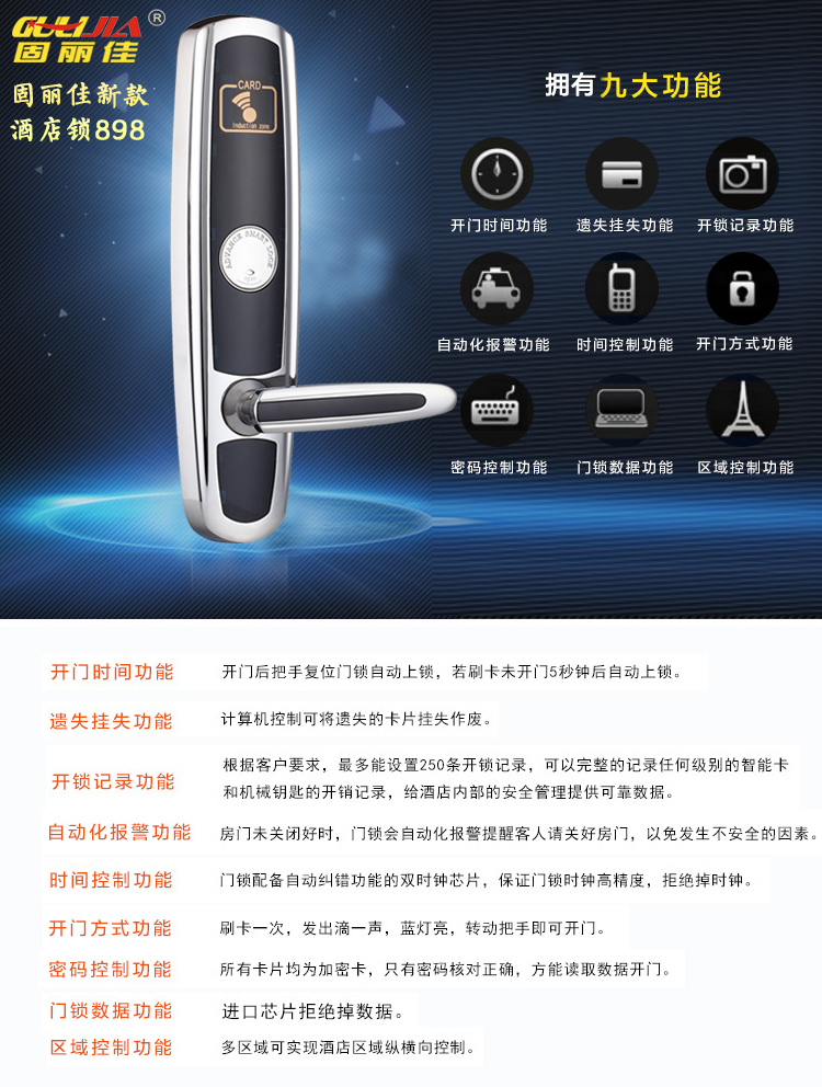 酒店鎖之所以能成為目前暢銷的一個(gè)鎖具,它的功能強(qiáng)大是一種原因,外觀設(shè)計(jì)也是一個(gè)吸引人的重要原因。選擇酒店鎖的人,喜歡的是他精美設(shè)計(jì)的外觀,具有非常時(shí)尚的大氣感,利用感應(yīng)功能,能夠方便開啟,無需攜帶機(jī)械鑰匙。作為日趨智能化的今天,無論是家具,酒店,還是辦公場(chǎng)所大家都在往使用酒店鎖的趨勢(shì)上邊發(fā)展,固麗佳致力于讓智能鎖走進(jìn)千家萬戶!